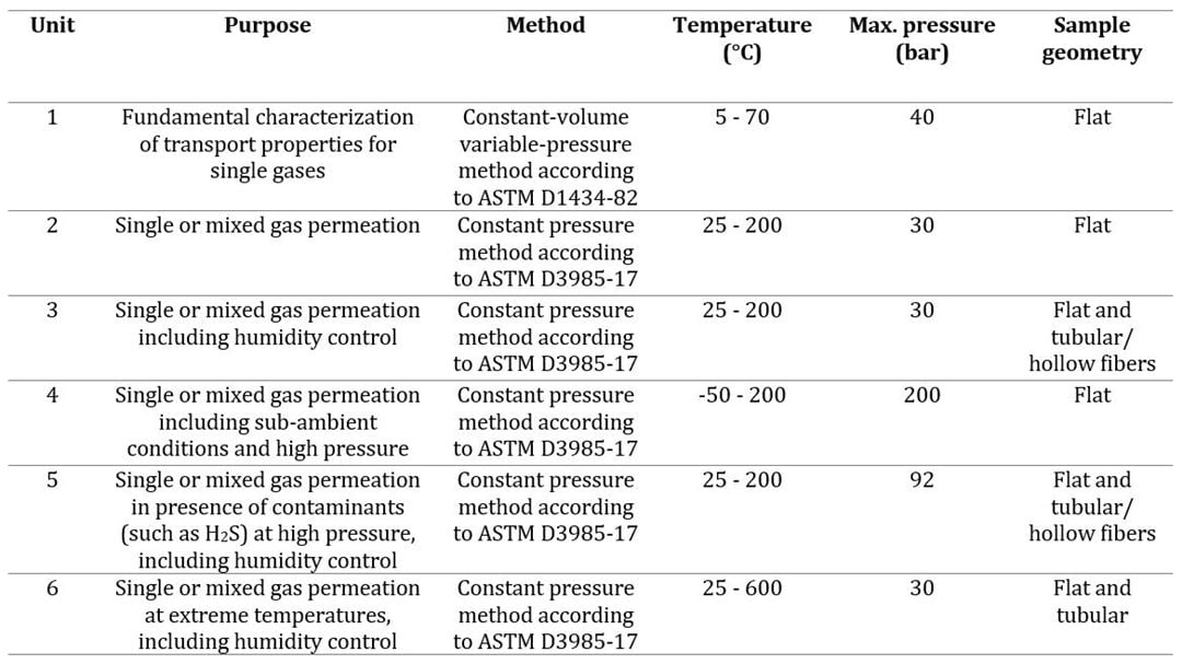 Equipment available for evaluating single and mixed gas permeation, presence of contaminants (such as H2S, NOx etc.), under normal and extreme conditions.