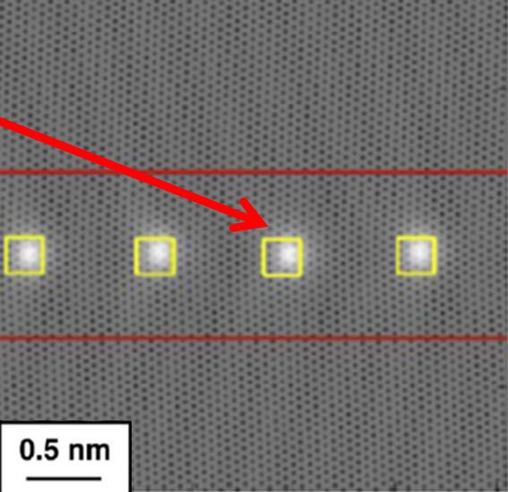 Slik ser det ut når forsker Qiang Du bruker matematikk til å simulere hva som skjer på nanonivå i en aluminiumlegering som varmebehandles. «Lyspunktene» som pila peker mot, er gryende partikler. Firkanten nederst i venstre hjørne angir målestokken (0,5 nanometer er 0,0000005 millimeter). Foto: SINTEF
