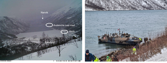 På bildet til venstre ser man hvor isen lå, mens skredrester dekket den eneste veien inn til Beisfjord. Havnen var ikke tilgjengelig, så en militærbåt (til høyre) måtte legge til land i fjæresteinene lenger unna når tidevannet tillot det. Foto: Vidar Løkeng/Fremover