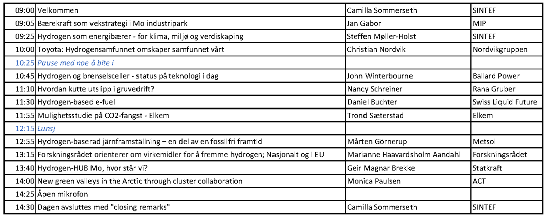 Mo industripark, Swiss Liquid Future (SLF), ledende brenselscelleprodusent Ballard Statkraft og SINTEF er bekreftede presentører.