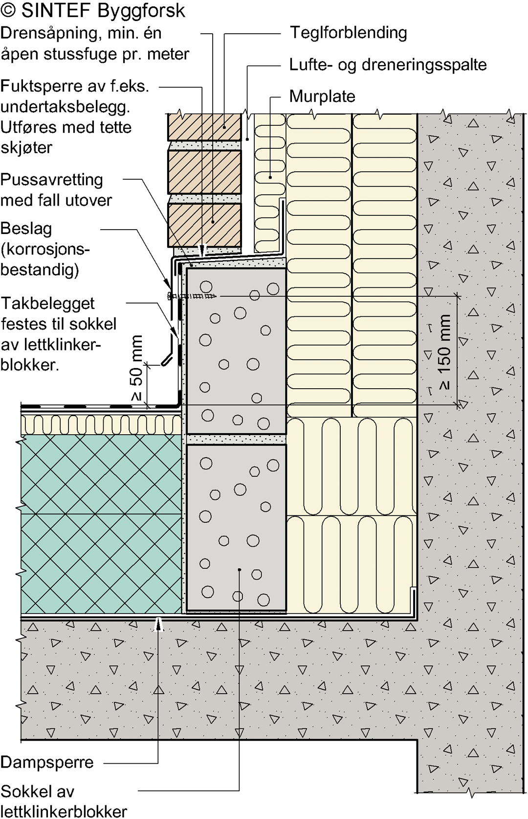 I tillegg må det være et vanntett sjikt som fanger opp vannet. Under teglforblendingen er det altså en kombinasjon av et vanntett membransjikt og et glidesjikt av beslag. Løsningen er vist i figur 4.