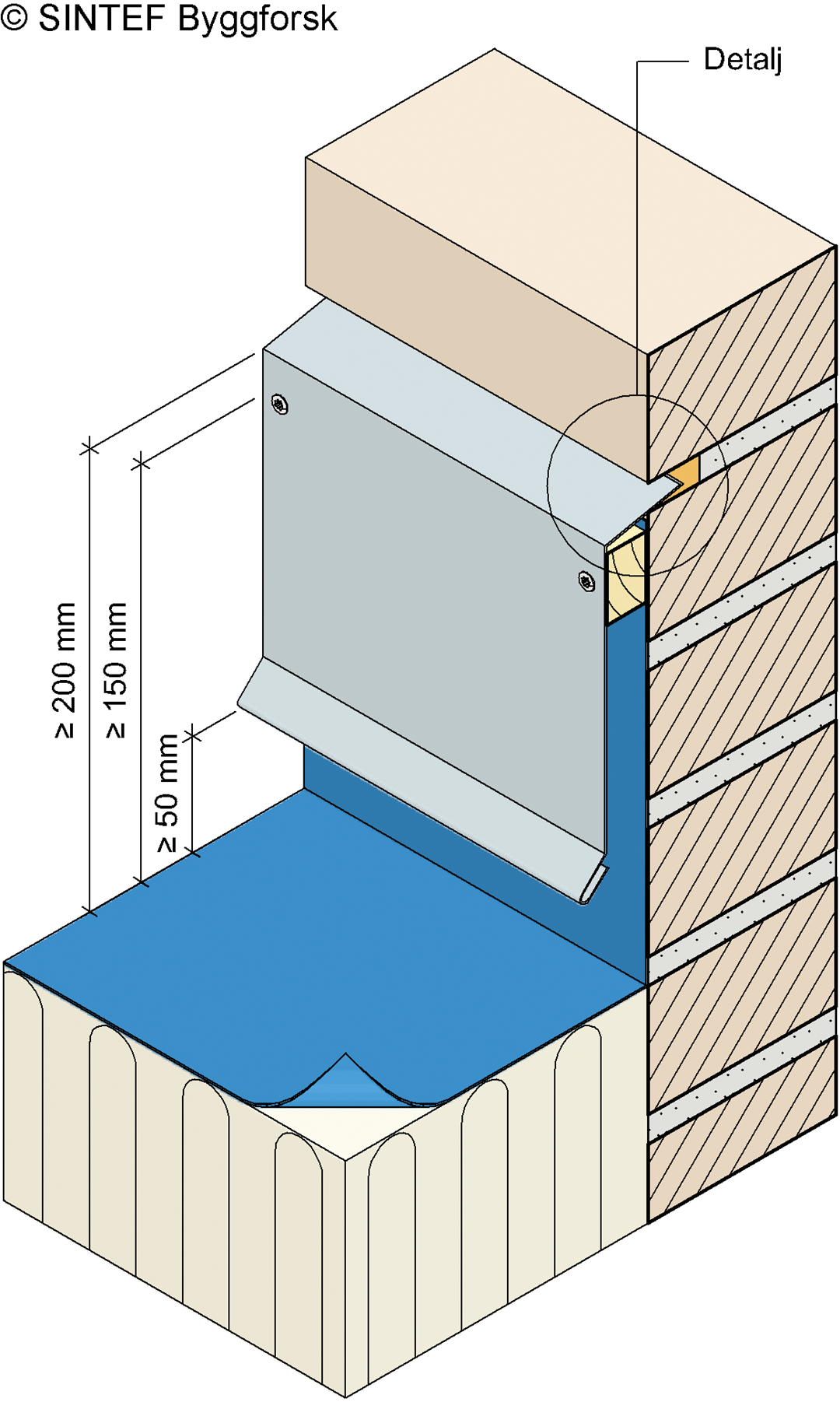Det innebærer at detaljløsningen i bunnen av slike vegger utformes slik at vannet fanges opp og dreneres ut. I slike overganger brukes beslag som et glidesjikt.