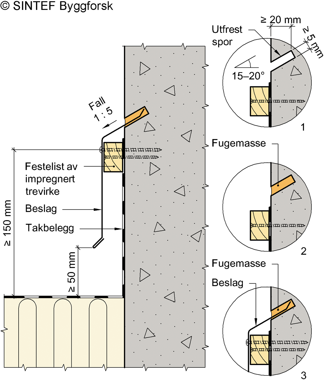 Overgang mellom flate tak og slike vegger utføres i prinsippet slik det er vist i figur 3. Forutsetningen er også her at selve veggen er uten skader, er godt vedlikeholdt og er tett mot vannlekkasjer.