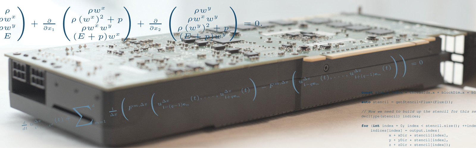 Our scientists have a long tradition for utilizing emerging computer hardware in computational modelling. For instance, starting in the early 2000s, we were among the pioneers in GPU computing, using programmable graphics cards for solving systems of conservation and balance laws (see, e.g., our tutorial paper from 2007). Heterogeneous computing involves employing a combination of different types of processors, such as CPUs and GPUs, to efficiently handle diverse computational tasks. In the context of numerical simulations, hardware acceleration aims to significantly speed up complex calculations by leveraging the parallel processing power of specialized hardware components.