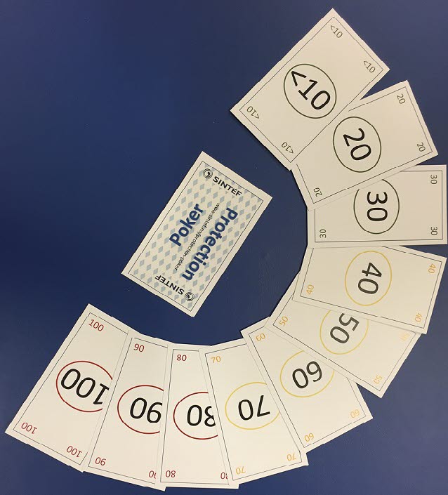 Inspired by professor Laurie Williams at NCSU, we have started to introduce development organizations in Trondheim to Protection Poker. The idea is to spend some time at the beginning of every sprint to do a practical risk assessment of every new (or modified) feature to be implemented in this iteration. For every feature, each developer is asked to estimate the relative value of the assets that the feature affects, and to what extent the feature affects the exposure of the system. When developers disagree, the moderator seeks to achieve consensus by converging on mutually agred values.