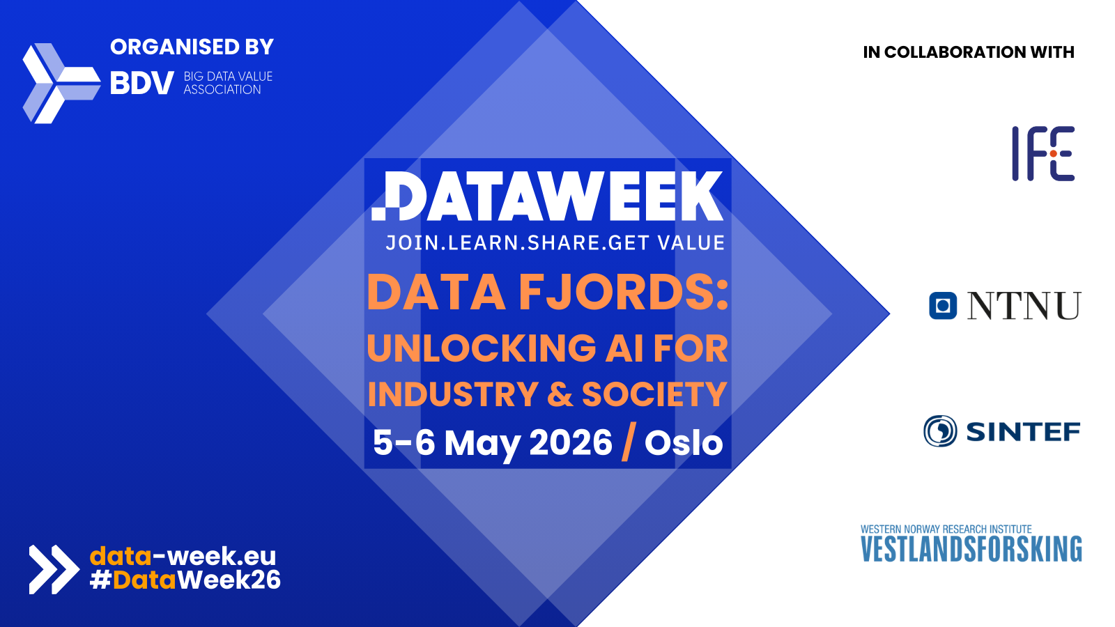 Data Week 2026 is a two-day in-person conference taking place in Oslo, Norway, on May 5–6, 2026. The event is organized by the Big Data Value Association (BDVA) in collaboration with BDVA members: the Institute for Energy Technology (IFE), the Norwegian University of Science and Technology (NTNU), SINTEF, and Vestlandsforsking.