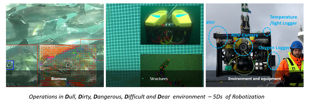 The team targets novel research and innovative solutions for robust, safe, efficient autonomous Monitoring, Inspection and Intervention operations in fish farms to reduce costs, risks, increase objectivity and production, and contribute to better fish welfare. Although our main target is the aquaculture industry, the obtained knowledge and developed technologies are also applicable to address the challenges of several other industries such as fisheries, offshore wind farms or subsea oil and gas installations.