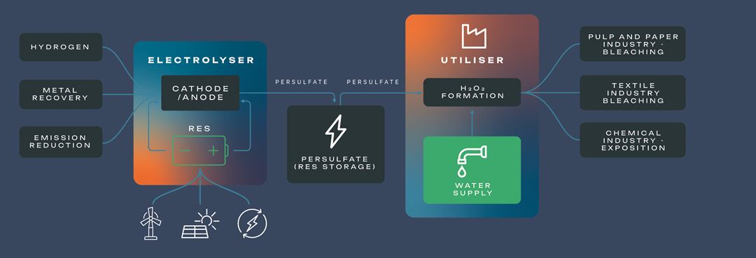 Hydrogen peroxide (H2O2) is used as a whitener or disinfection chemical in many industries, such as pulp and paper, textiles, electronics, resins, coatings, disinfection, and water treatment. The chemical is traditionally produced in centralised energy intensive production and subsequently provided and used in these sectors.