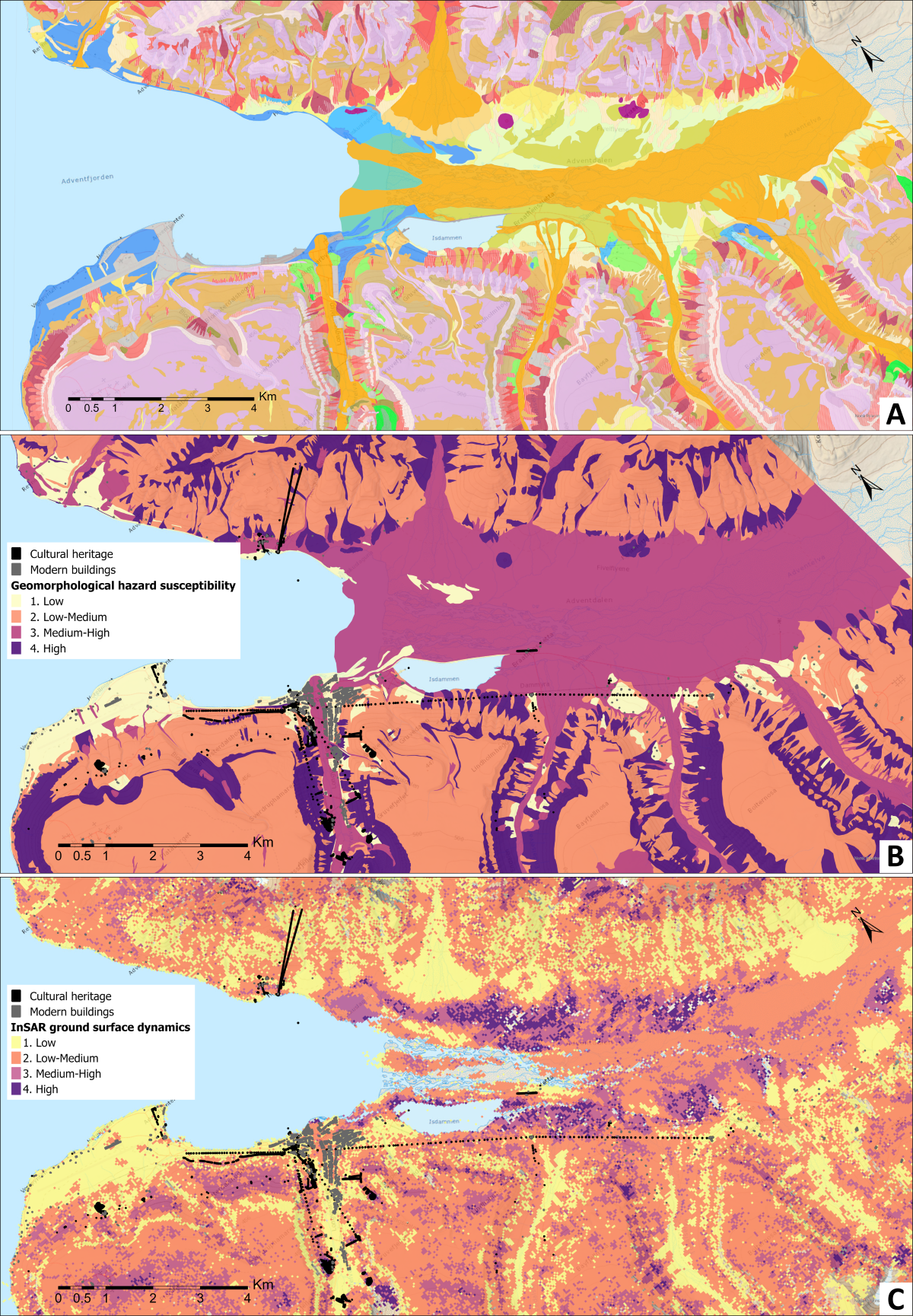Together, the geomorphological and the InSAR ground movement maps form a base that enables a combined evaluation of several natural hazard types. The maps on page X illustrate some of the new data for the Longyearbyen and Adventdalen area. Similar datasets have been produced for Brøggerhalvøya and Ny-Ålesund.