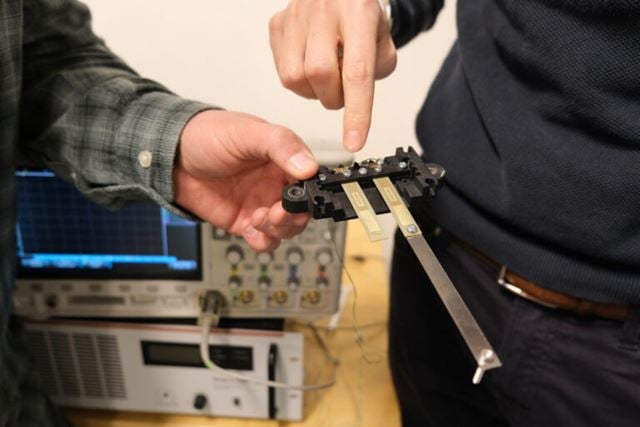 The basic principle behind vibration-driven energy is simple. Movement can be converted into electricity. Here, experiments are being carried out in the lab at SINTEF. Photo: Emma Sæter