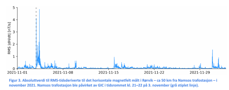 The blue graph shows how great the geomagnetic activity is, that is, the effect of the solar storm on the ground. The grey dotted line shows when the transformer station in Namsos was affected.