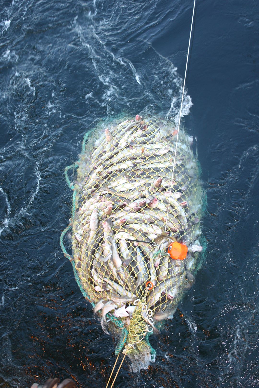 From SINTEF's research cruise in the Barents Sea: Trawl bag, with three tonnes of fish, which is closed and detached from the trawl. (Photo: Manu Sistiaga, SINTEF) |