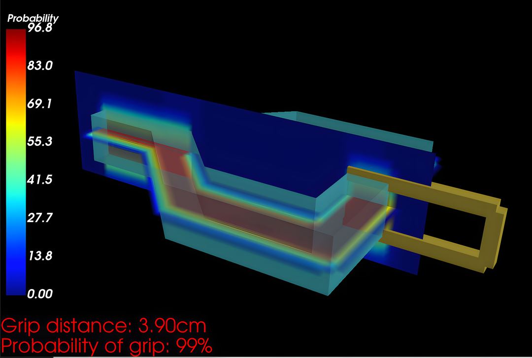 In Figure 3 we show an example where we have used the pose distribution (1 000 samples) given by the proposed algorithm when detecting an Aruco marker at an attenuation length of 0.7 m at 90 cm distance. We create a marginal probability volume around the gripper which tells us the probability of the fish-tail being present in that particular voxel. This is done by transforming the fish-tail handle with the 1 000 pose samples and for each time a voxel is inside the transformed model an accumulator is incremented for that voxel. When the gripper (the yellow model to the right in the figure) is closing its grip, we can report the probability of whether it is now gripping the fish-tail. The snapshot of the gripping process in the figure shows that the probability of the grip is 99 %.