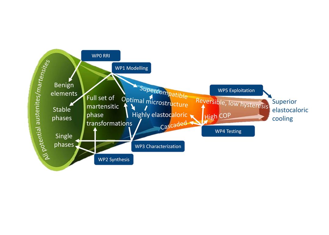 The project is based on a thermodynamic cycle in which solid-state phase transformations release and absorb heat. Long-term operation without loss or fatigue is a prerequisite. This can be achieved by so-called supercompatibility of the two phases, which is described by mathematical correlations between their lattice parameters. Cool'em aims to identify new superreversible materials with a high cooling coefficient of performance (COP). The latest available theoretical tools will be used to predict new, supercompatible martensitic phase transformations and elastocaloric materials with very high COP. A range of advanced synthesis and processing techniques will be used to vary and optimize the microstructure of selected compounds. State-of-the-art characterization and testing tools will be used to establish correspondence between processing parameters and functional behavior. Digitalization of experiments will speed up and target the fabrication of materials towards optimal ones.