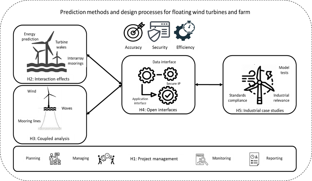 The underlying idea of the project is to make floating offshore wind a more competitive source of energy by lowering the LCoE through reduced uncertainty in the investment and planning phase, and improved accuracy, collaboration and efficiency in the design and engineering phase.