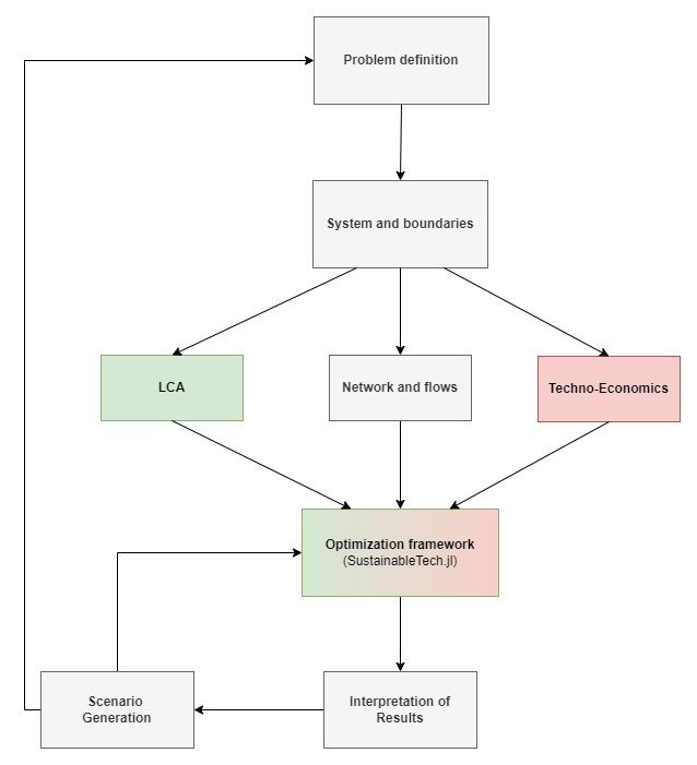Our ambition is to create a framework to perform streamlined Techno-Economic Assessments (TEA) and Life Cycle Assessments (LCA) that support decision-making for sustainable development. The framework can be customized to guide businesses in making strategic decisions from product composition, raw material supply and optimal value chains, to the more operational decisions related to logistics and production planning. The framework unifies economic and environmental indicators under common assumptions, offering decision makers a holistic understanding and enabling consistent trade-off exploration across various value chains and market scenarios.