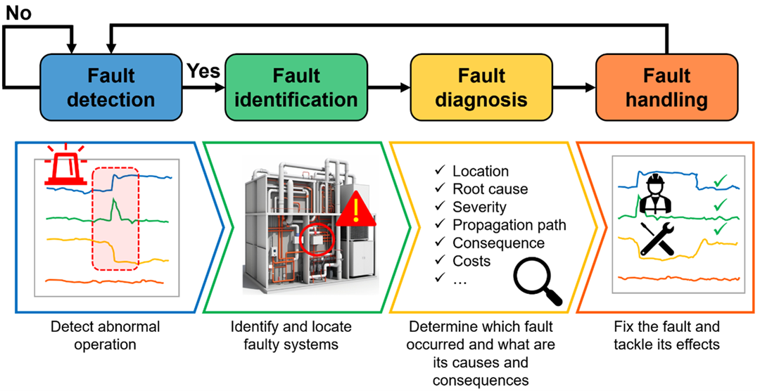 The current development of flexible, interoperable and automated FDD solutions for building systems is based on data-driven machine learning methods deciphering intricate patterns and correlations in the operation data to detect, identify and categorize faults. Pinpointing the source and cause of the fault greatly helps the fault handling process (impact analysis, prioritization, and fixing the fault with the appropriate response). It also enables predictive maintenance to tackle systems’ degradation before critical and costly impact occurs.