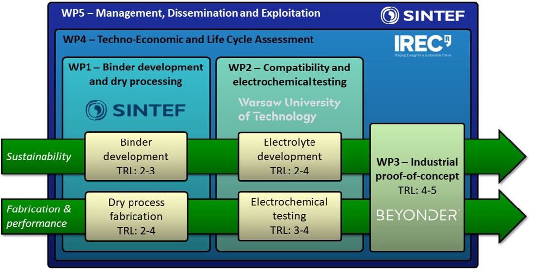 The research activities in ULTRADRY is divided into four scientific work packages (WPs), each lead by one of the four project partners with the aim to optimize the battery fabrication process and performance, and to improve process sustainability, as illustrated in the schematic.