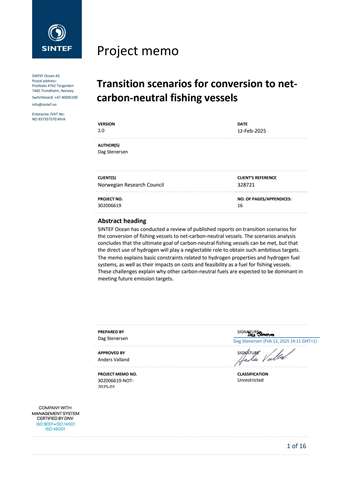 SINTEF Ocean has conducted a review of published reports on transition scenarios for the conversion of fishing vessels to net-carbon-neutral vessels. The scenarios analysis concludes that the ultimate goal of carbon-neutral fishing vessels can be met, but that the direct use of hydrogen will play a...