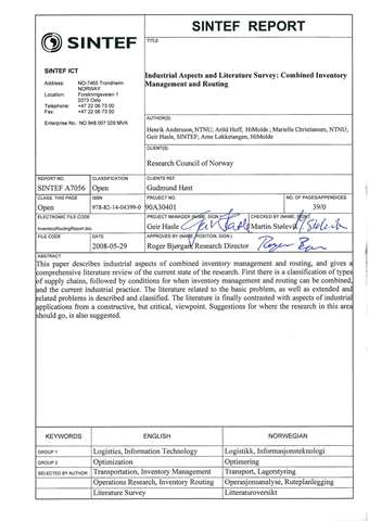...combined inventory management and routing, and gives a comprehensive literature review of the current state of the research. First there is a classification of types of supply chains, followed by conditions for when inventory management and routing can be combined, and the current industrial practice...