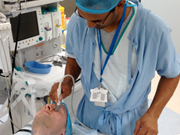 Llewellyn Padayachy is holding the probe against a patient's eye socket. By doing so he is able to obtain ultrasound images and information in his work. Photo: SINTEF. SINTEF researchers...