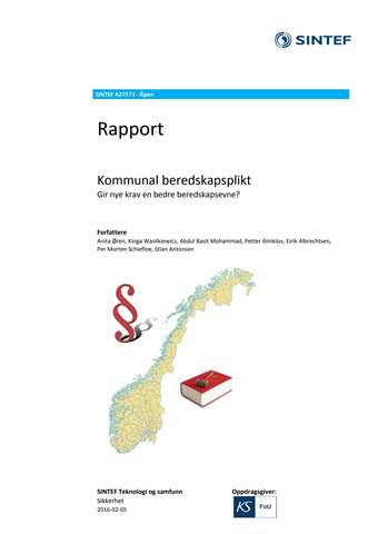 Formålet med denne rapporten har vært å belyse kommunenes evne og mulighet til å oppfylle de krav og forventninger som fremkommer av sivilbeskyttelsesloven med forskrift som pålegger kommunene en generell beredskapsplikt. Prosjektet er utført av SINTEF, NTNU Samfunnsforskning og NTNU, på oppdrag fra...