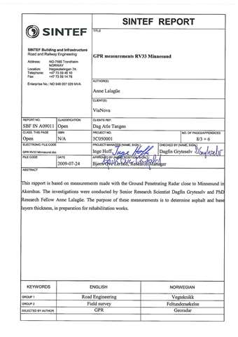 This rapport is based on measurements made with the Ground Penetrating Radar close to Minnesund in Akershus. The investigations were conducted by Senior Research Scientist Dagfin Gryteselv and PhD Research Fellow Anne Lalagüe. The purpose of these measurements is to determine asphalt and base layers...