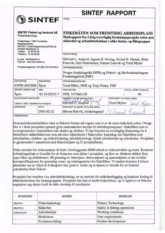 Personulykkesstatistikken viser at fiskeriet fortsatt må regnes som et av de mest risikofylte yrker i Norge. Det er i dette prosjektet spesielt gjort undersøkelser knyttet til arbeidsoperasjoner i fiskeflåten som er overrepresentert i statistikken mht skader og ulykker. Vi har benyttet en...