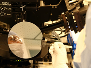 Researcher and blog author Elizaveta Vereshchagina in the laboratory. Microfluidics technology has a variety of applications, including DNA analysis and organ-on-a-chip. The photo shows a 6-inch silicon wafer during processing in cleanroom. The dots are inlets to and outlets from the microfluidic channel...