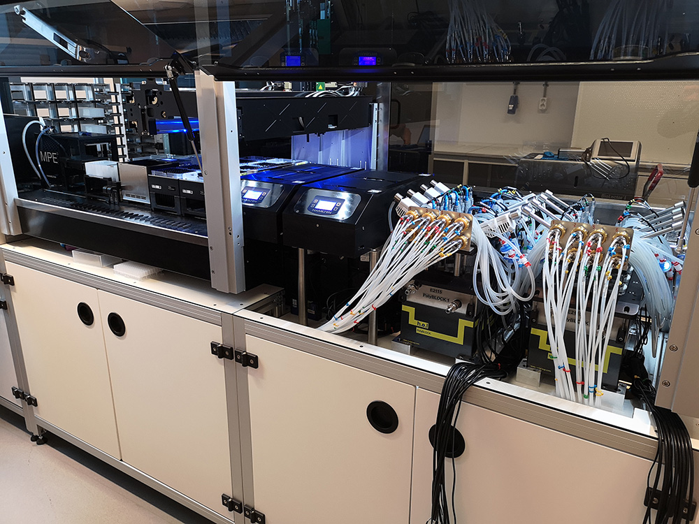 Det automatiserte H.E.L./Hamilton‑systemet med 16 reaktorer (50-150 mL) gir individuell kontroll over temperatur, røring, pH, DO, fødelinjer, avgass‑analyse og full arbeidsflytautomatisering via robotisert håndtering.