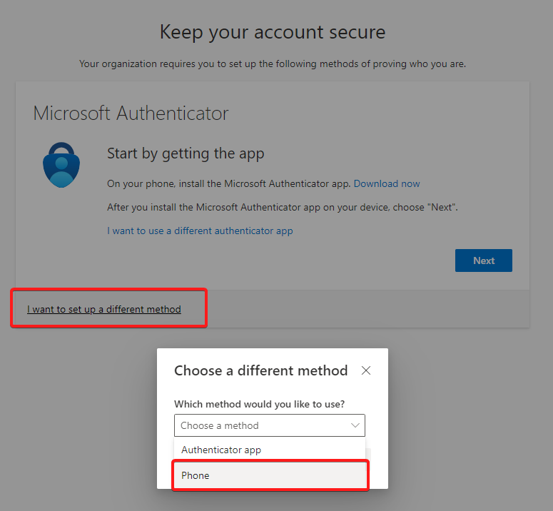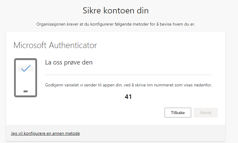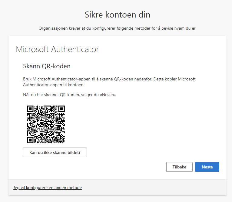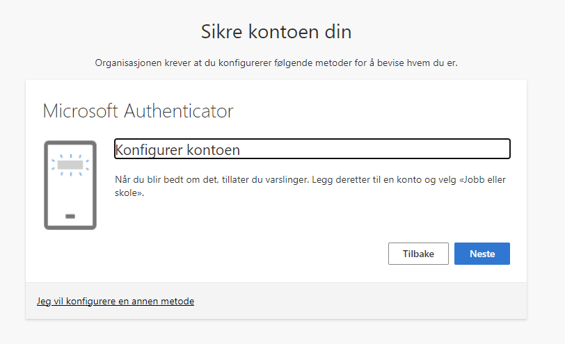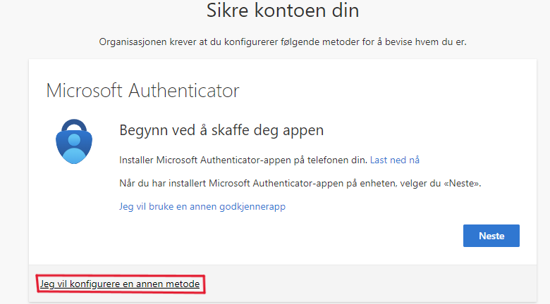 3. Du blir bedt om å bruke en autentiseringsmetode for å bekrefte at du er du. Her har du flere alternative fremgangsmåter. Du kan enten velge å bruke "Microsoft Authenticator"-appen som er noe vi anbefaler. For å laste den ned følger du informasjonen i det største dialogfeltet som dukker opp. Hvis du ikke ønsker å bruke app, kan du trykke på "Jeg vil konfigurere en annen metode":