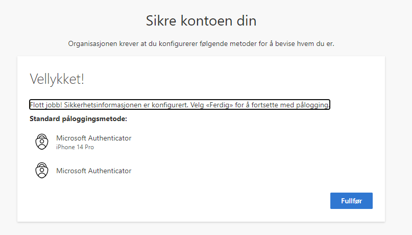3.1.4 Godt jobba! Du har nå sikret din konto ved hjelp av authenticator-appen. Trykk "fullfør" og du kan nå logge inn i SINTEF-domenet med en sikret konto.