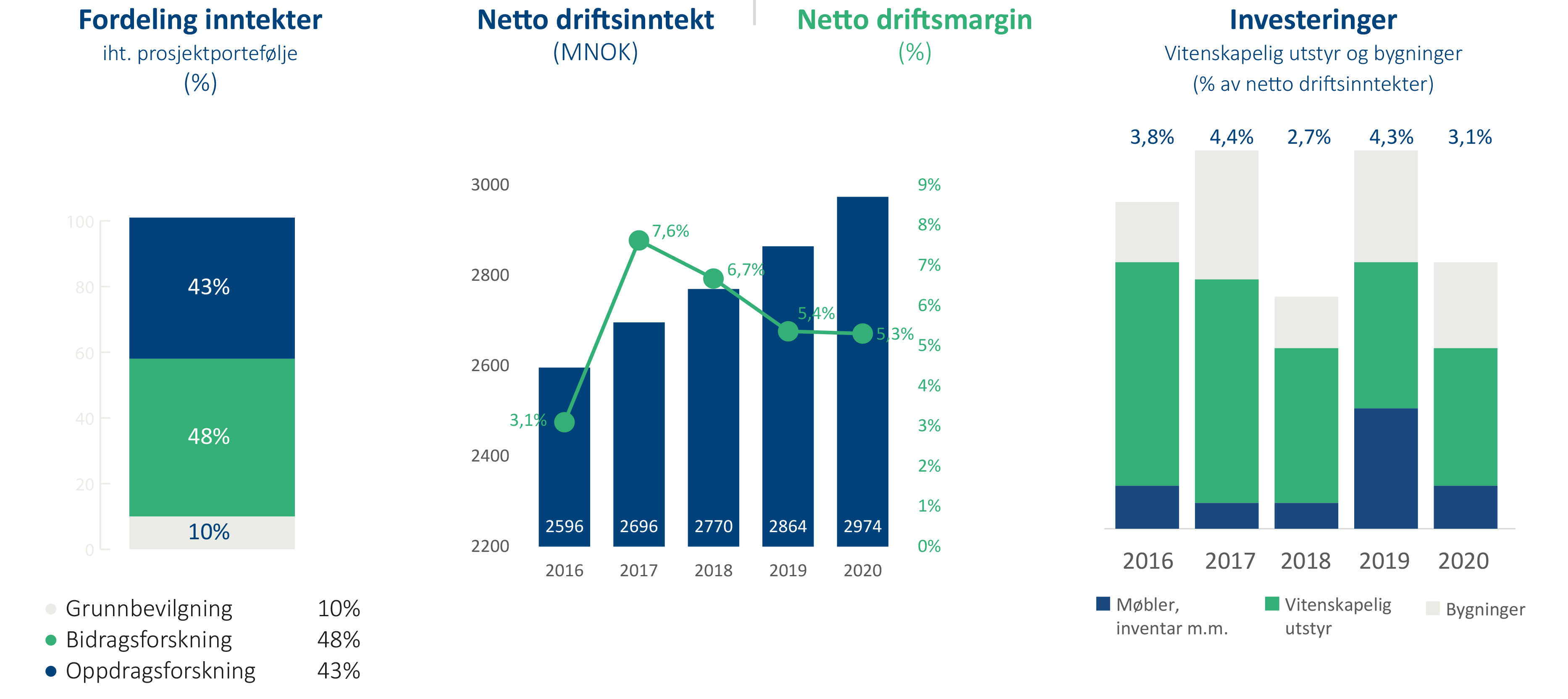 I partnerskap med kunder og virkemiddelapparatet, blant annet støttet med ekstraordinær grunnbevilgning til de teknisk-industrielle instituttene, løpende IPN-utlysninger og «Grønn plattform», kunne SINTEF fortsette å bidra til den grønne og digitale omstillingen gjennom krisetid. Vi har i 2021 vokst med 9,2 prosent i nettoinntekt og har et sterkt driftsresultat, på 268 millioner (8,2 prosent).