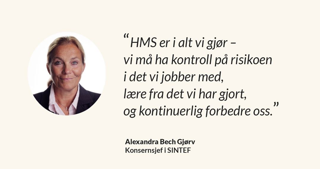 I SINTEF skal HMS være en integrert del av daglig drift og utvikling. Vi har en risikobasert tilnærming til aktivitetene våre, og jobber kontinuerlig for å kartlegge og iverksette tiltak for å etablere tilstrekkelige barrierer og redusere risiko.