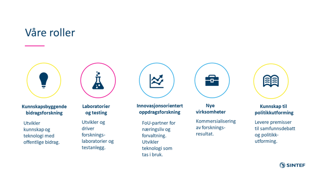 Ved å jobbe i spennet fra forskning til kommersialisering og bedriftsetablering, spiller SINTEF mange roller, nasjonalt og internasjonalt.