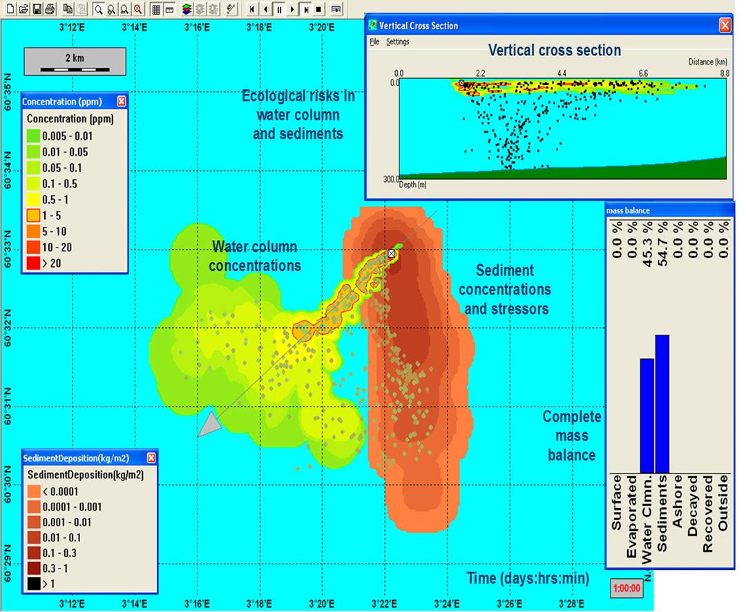 Modellen beregner forvitring: Fysiske, biologiske og kjemiske prosesser i sjøen som bestemmer oljens egenskaper. Mange av disse prosessene er sterkt koblet til laboratorieaktiviteter ved SINTEF for studier av oljeforvitring. Beredskaps- og respons-strategier spenner fra mekanisk oppsamling av olje til kjemisk dispergering på overflateolje og ved utslippspunkt.