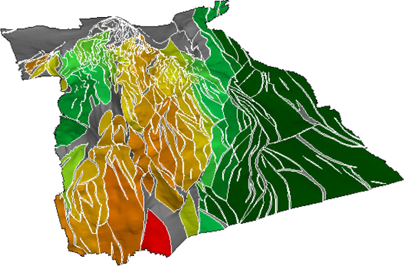 Lateral fluid flow is modelled using a transmissibility algorithm defined by the dip-slip displacement and burial depths of the faults. Hence, the geo-mechanical properties for the caprock vary through time as a function of subsidence.