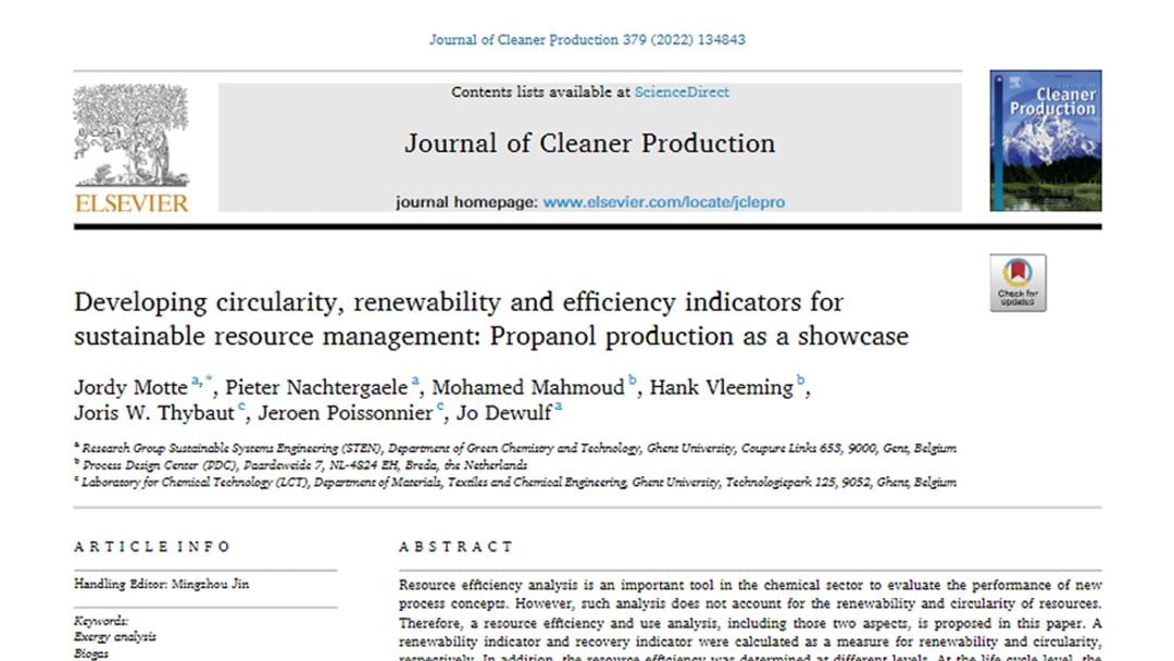 A sixth C123 publication has been published in the journal Journal of Cleaner Production. The manuscript ‘Developing circularity, renewability and efficiency indicators for sustainable resource management: propanol production as a showcase’ by Jordy Motte,Pieter Nachtergaele; Mohamed Mahmoud, Hank Vleeming, Joris W.Thybaut, Jeroen Poissonnier and Jo Dewulf (from UGent and PDC).