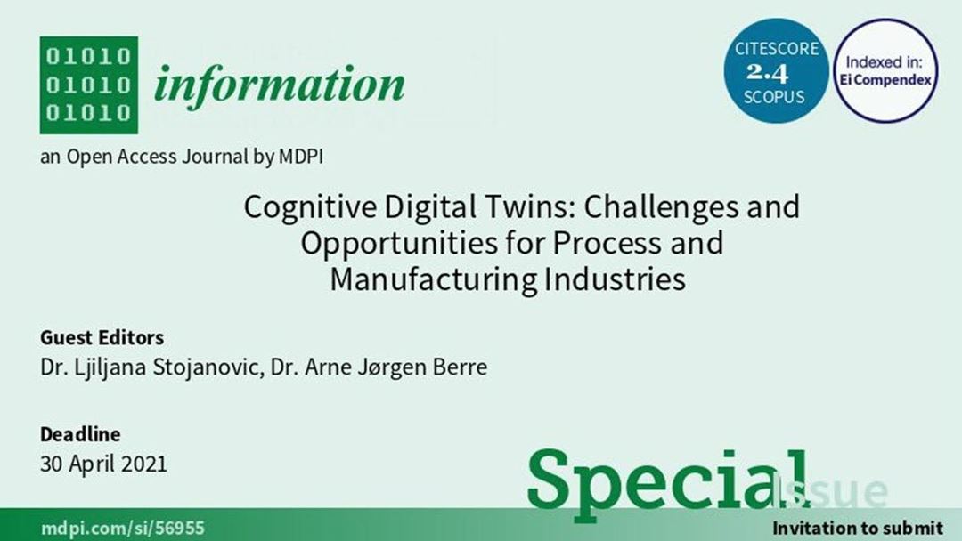 COGNITWIN-Partners Dr. Ljiljana Stojanovic and Dr. Arne Berre are guest editors of a special issue about Cognitive Digital Twins @ Information MDPI.