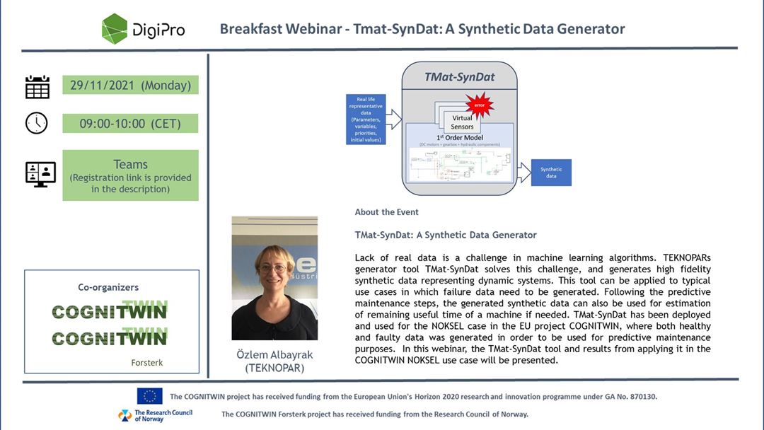 On 29th November 2021, the COGNITWIN project partner TEKNOPAR participated in a webinar on Tmat-SynDat: A synthetic Data Generator. The event was organized by DigiPro and COGNITWIN Forsterk.