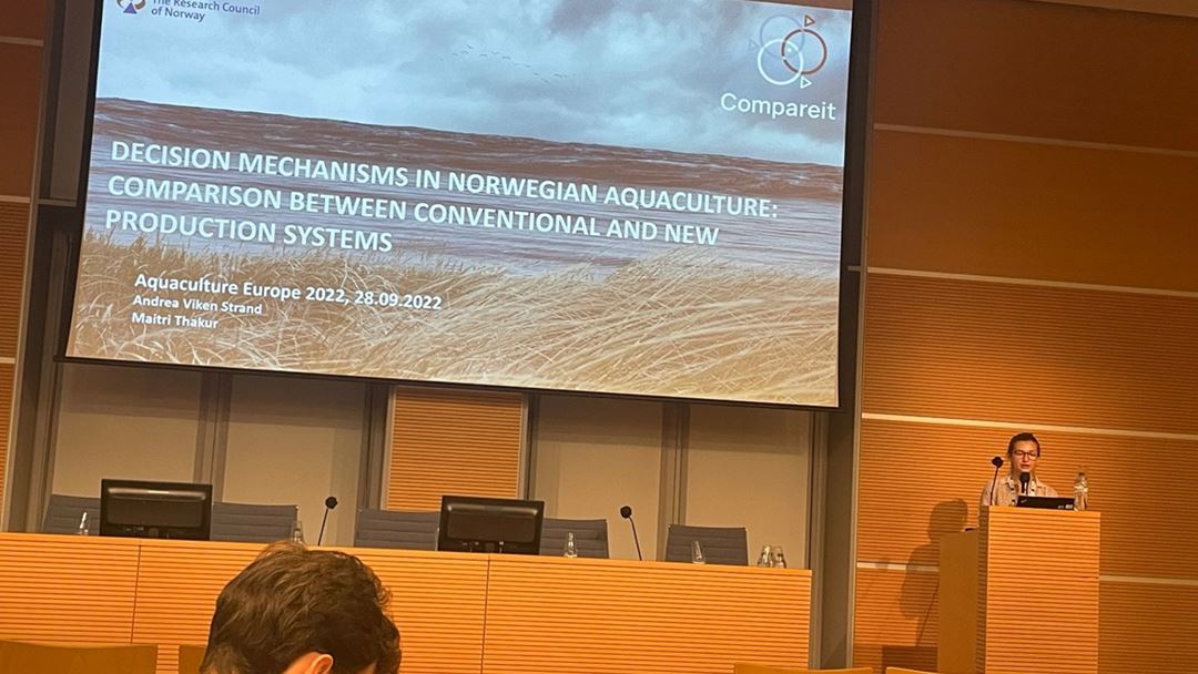 Fra arbeidspakke 3 presenterte Andrea Viken Strand (Master of Science, Klima og Miljø, SINTEF Ocean) i sesjonen for "Socio-Economic Challenges for Sustainable Aquaculture in a Changing Environment".