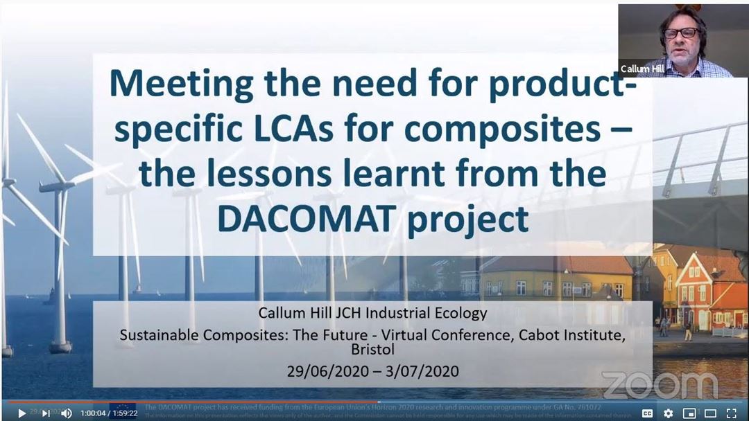Callum Hill gave a presentation of the life cycle assessment work that JCH Industrial Ecology is performing within the DACOMAT project in June 2020 for the online conference ‘ Sustainable Composites: the Future’.