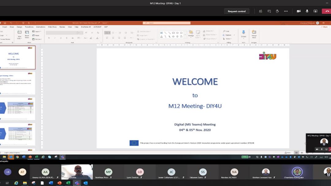DIY4U consortium organized its M12 project meeting digitally on Microsoft Teams. The meeting was held on 4th and 5th November, with almost 31 people joining the meeting. The status, work plan and other relevant technical details were presented and discussed. The project has made significant progress regardless COVID-19 situation. Second General Assembly of the project took place in the end of the meeting on 5th November. The members of External Expert Advisory Board (Randi Midtkandal Edgar and Janne Suhonen) have also participated in the meeting and presented their profile and expertise.