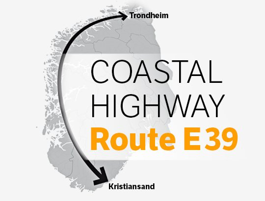 The route runs from Kristiansand in the south to Trondheim in the north, and is approximately 1100 km long. The route runs through six counties, and the cities of Stavanger, Bergen, Ålesund and Molde. Travel time today is around 21 hours, and road users need to use seven different ferry connections. The aim is to create an improved E39 without ferries, which will reduce travel time by half. The route will be almost 50 kilometres shorter. The reduction in travel time will be achieved by replacing ferries with bridges and tunnels, in addition to upgrading a number of road sections on land. Preliminary estimates show that the required investments and improvements will cost approximately NOK 340 billion.