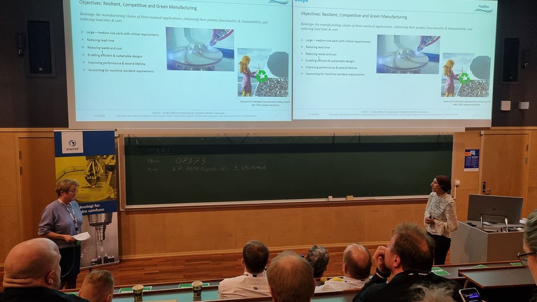 On behalf of the project consortium, Afaf Saai (SINTEF, PC) and Mette Lokna Nedreberg (Kongsberg Maritime) presented the successful results of FlexiMan project at the National Conference for Additive Manufacturing organized by Norwegian Additive Manufacturing Cluster. We presented the key elements of the flexible and sustainable manufacturing approaches applied to water jet impeller, multi-material pump impeller, and hollow propeller blade. We demonstrated that DED can be optimized to fulfil all requirements of critical parts, and the great benefit for new lightweight and multi-material designs. We also demonstrated the performance of DED manufacturing solutions versus conventional manufacturing solutions.