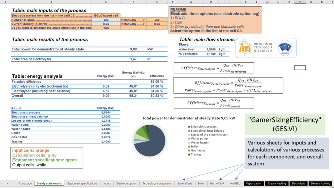 GES (version VI) enables 0D analysis of the complete system, including energy balance and power demands of each component. The inputs of the calculations (electrochemical cells and bundles characteristics, process conditions and single-component efficiencies) are gathered and are based on experimental set of data generated in GAMER. The main outcomes of GES.VI are reported, indicating the electrolyser system designed in GAMER, size of the different components and the expected energy efficiency and energy -cost of hydrogen.