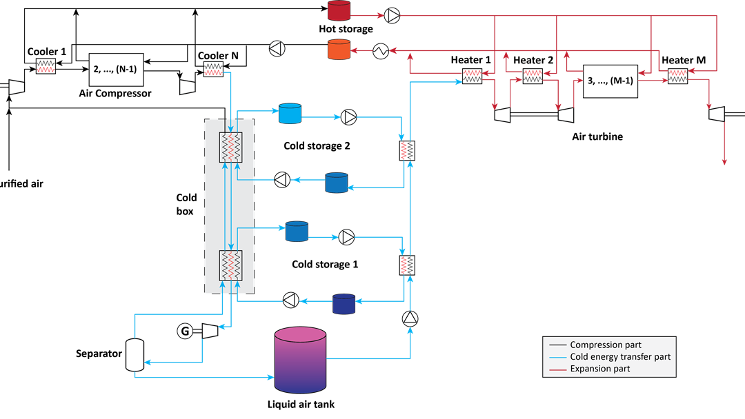 Energy storage technologies are required to ensure stability of energy systems when the share of renewable energy forms (wind and solar) is increasing. Liquid air energy storage (LAES) is a promising technology for storing electricity with certain advantages, such as high energy density and being geographically unconstrained. However, one drawback of a standalone LAES is the relatively low round-trip efficiency (RTE). My PhD project mainly focuses on developing process models of the modified LAES for systematic optimisation in order to objectively assess measures for performance improvement. This research work includes the development of different configurations for the cold energy recovery cycles, the investigation of the effect of various combinations between the compression and expansion sections on the LAES, and the utilisation of surplus compression heat in additional thermodynamic cycles, such as Organic Rankine Cycle (ORC), Absorption Refrigeration Cycle (ARC), and High-Temperature Heat Pump (HTHP).