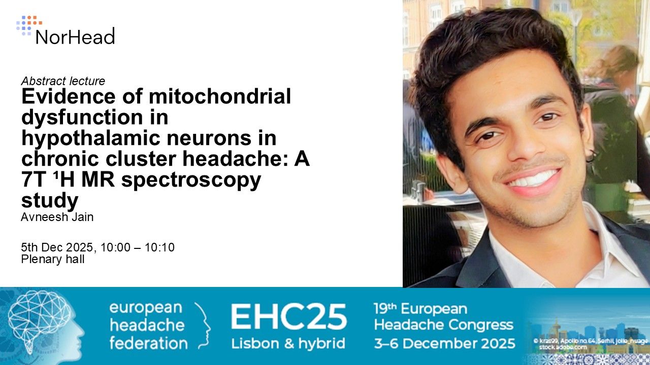 Avneesh mottok prisen for forelesningen: «Evidence of mitochondrial dysfunction in hypothalamic neurons in chronic cluster headache: A 7T ¹H MR spectroscopy study». Presentasjonen var imponerende, og viser hans sterke engasjement for å øke forståelsen av hodepinelidelser.