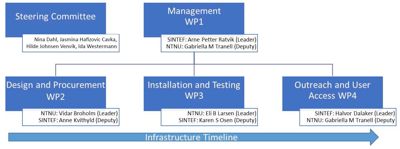 The implementation of the infrastructure is organised in three main work packages, in addition to the overall management. WP2 on design, tender and procurement is led by Vidar Broholm at NTNU, with support from Anne Kvithyld at SINTEF. WP3 is responsible for the logistics related to the installation of the equipment in our laboratories, and is led by Eli B. Larsen at NTNU, in cooperation with Karen S Osen at SINTEF. WP4 is responsible for establishing outreach activities in cooperation with the infrastructure management, access systems for external as well as internal research activities, and systems for covering operational costs of the infrastructure. This WP is led by Halvor Dalaker at SINTEF, with Gabriella M Tranell as the deputy.