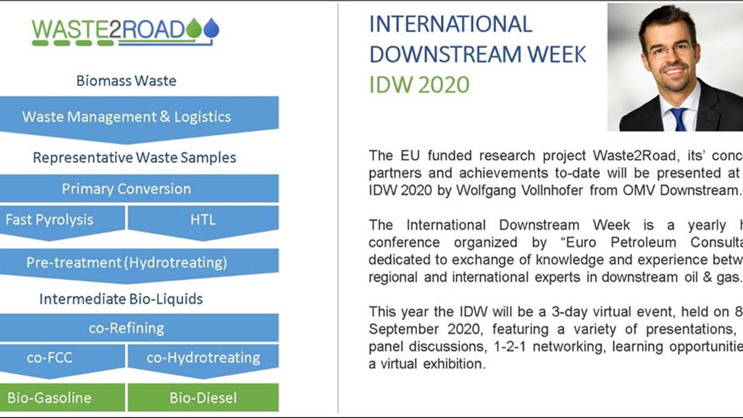 Wolfgang Vollnhofer from OMV Downstream has presented the WASTE2ROAD project, its concept, partners and achievements to-date at the International Downstream Week 2020, a 3-day virtual event held on September 8-10, 2020.